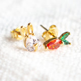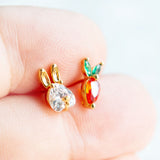 Cute and adorable crystal rabbit and carrot stud earrings in gold tone.