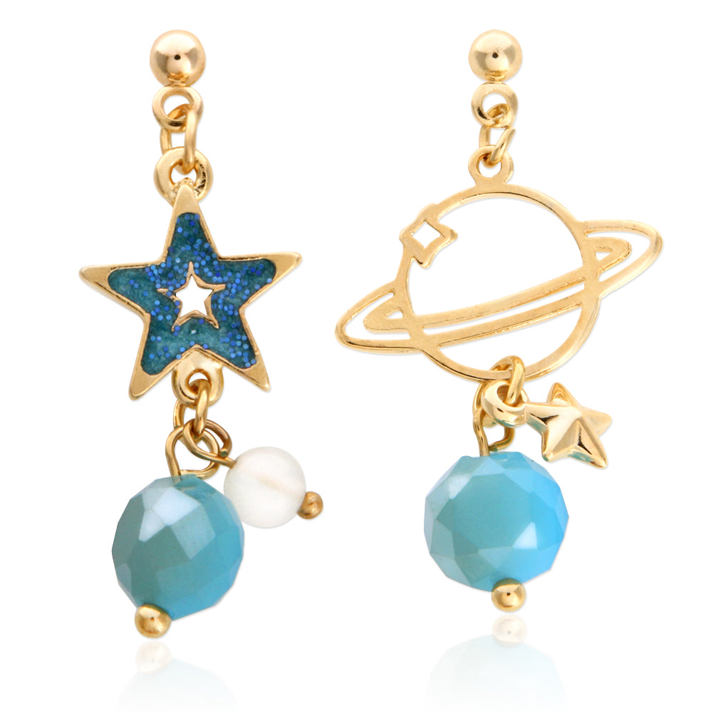 Trendy and Mismatched drop earrings featuring Planet/Star with Blue tone crystal and pearl beads.