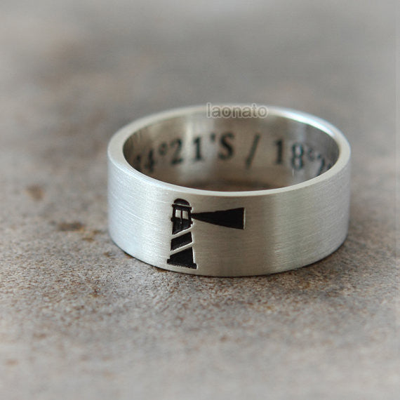 Personalized Horizontal Lighthouse Ring in 925 sterling silver/7 mm band ring, initials, date, words