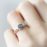 So unique and fun belt ring in sterling silver.